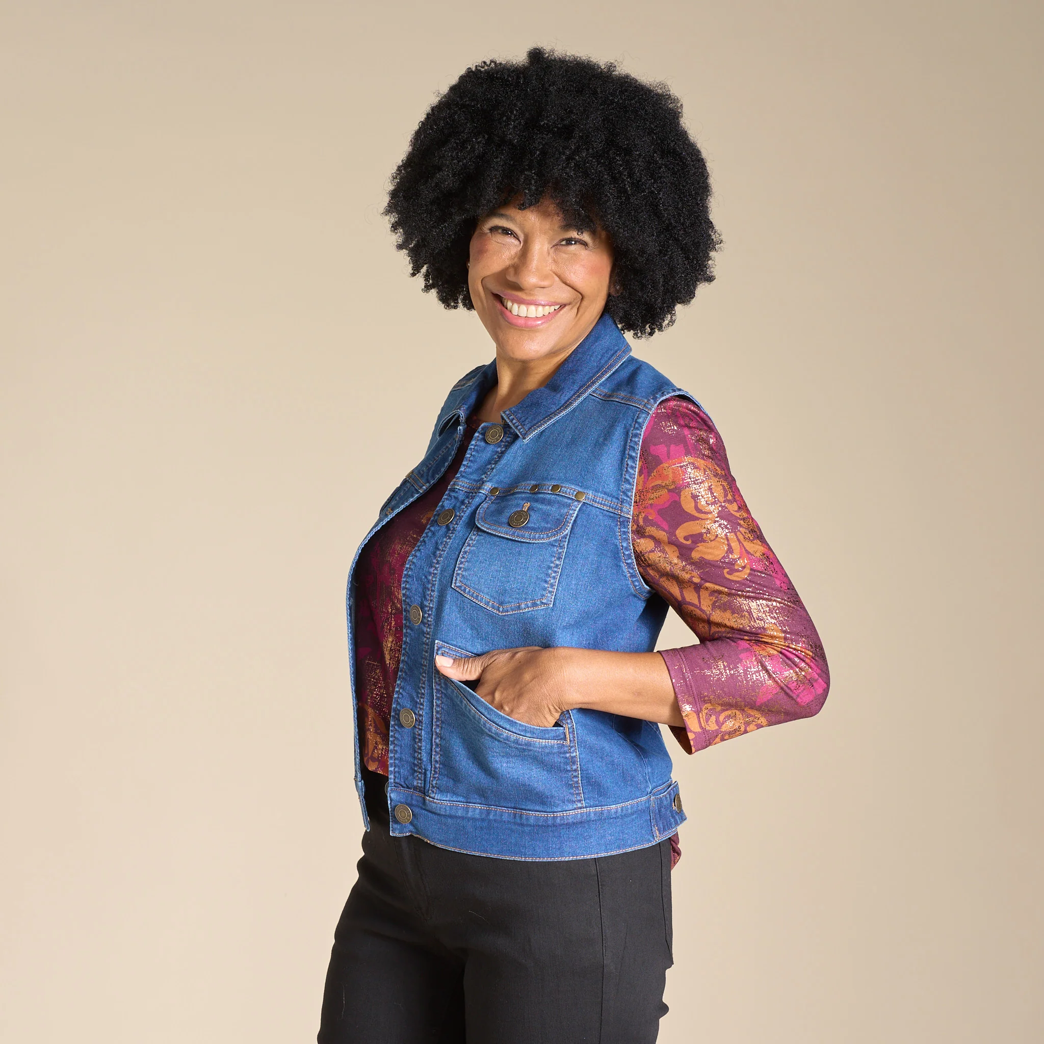 Elevate your outfit with our Denim Vest, featuring bold dome stud detailing and sleek front slant pockets that blend style with function. Designed as the ultimate layering piece, it effortlessly pulls your look together with a cool, confident finish.