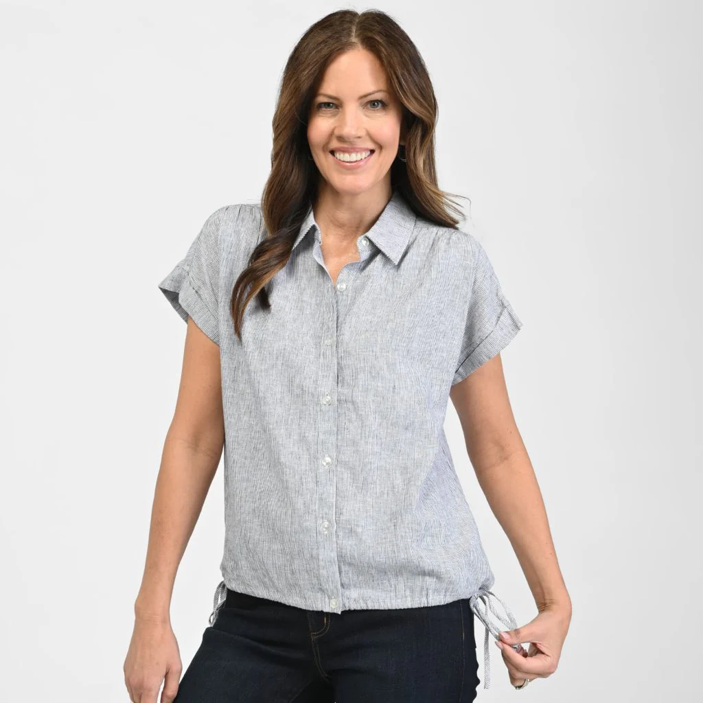 Embrace effortless versatility with our Drawstring Waist Short Sleeve Shirt, featuring an adjustable drawstring waistline to customize your perfect silhouette. Whether worn open or buttoned, its relaxed fit and shirring back details in stylish prints, denim, or stripes make it a must-have for laid-back, chic looks.