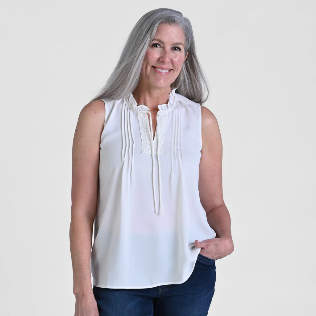 Bring a touch of feminine charm to your wardrobe with our Lace Trimmed Ruffle Neck Sleeveless Blouse, crafted from georgette fabrication and featuring pintuck chest details for a flattering and elongating silhouette. With an adjustable necktie and versatile styling options, this blouse can be worn solo for a soft, elegant look or layered with a cardigan or jacket for extra polish.