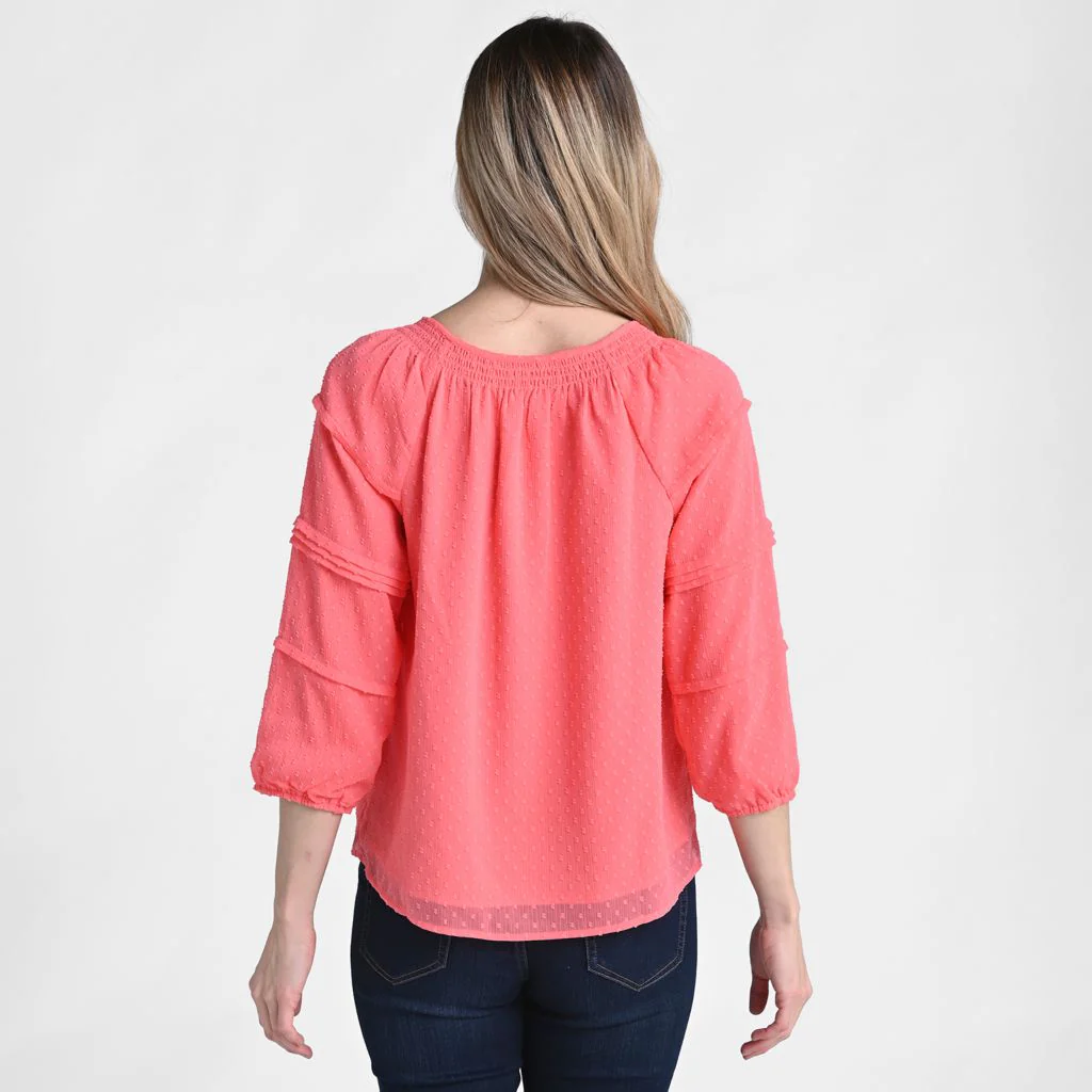 Elevate your style with our Pintucked Sleeve Peasant Blouse, crafted from sheer clip dot fabric with a matching lining for a flattering, drapey fit. Featuring feminine details like a shirred neckline and pintucked sleeves with elastic openings, this blouse comes in a neutral and a pop color, perfect for adding a touch of elegance to any outfit.