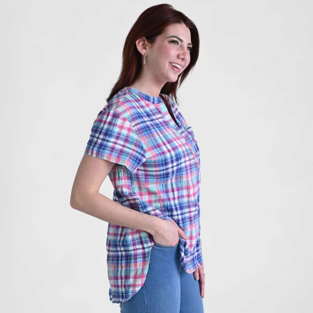 Add a touch of relaxed elegance to your wardrobe with our Plaid Y Neck Short Sleeve Top, featuring a crinkled textured fabric and a flattering high-low hem. Perfect for pairing with a fashion color skimmer or capri, this top brings effortless style and versatility to your everyday look.