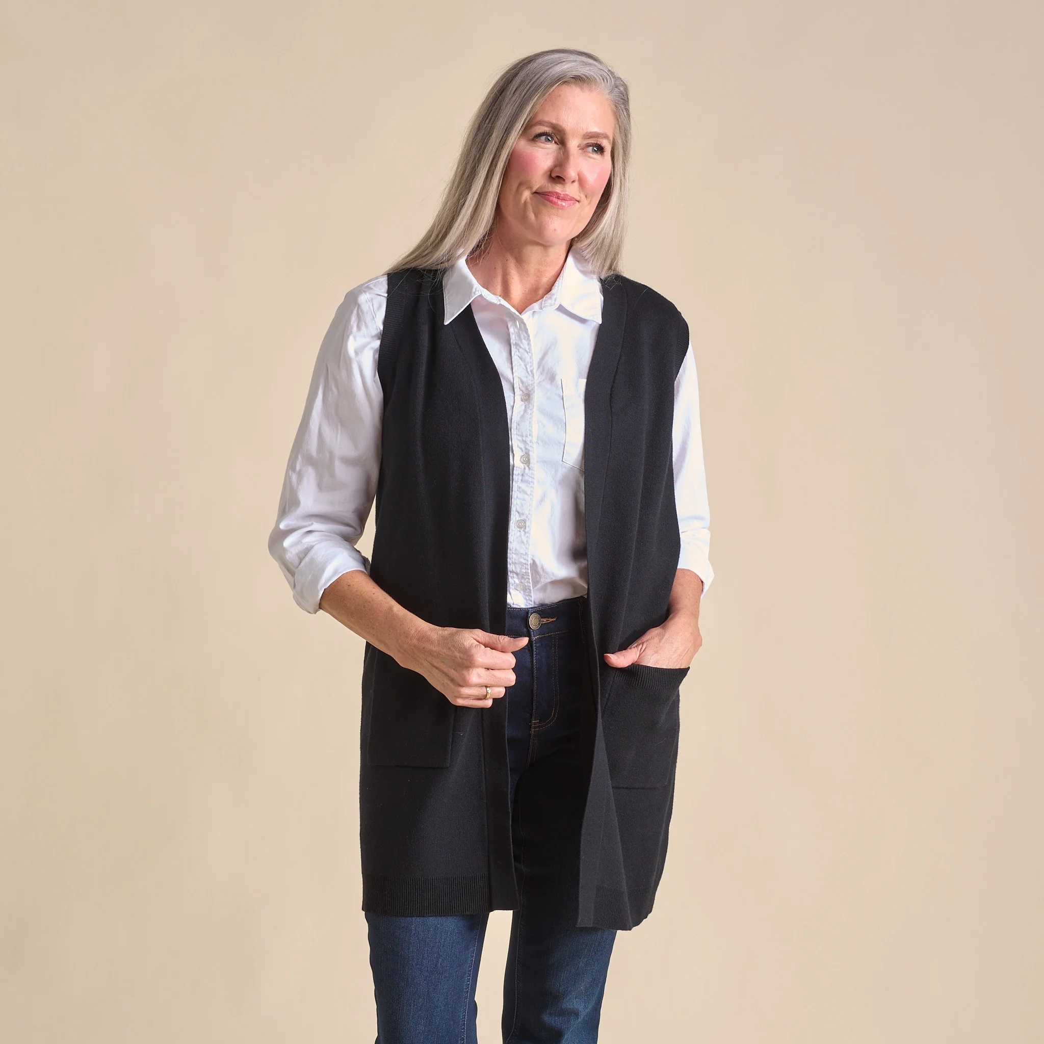 Wrap yourself in effortless style with our Open Front Sweater Vest, designed in a longer length for just-right coverage. Its versatile silhouette makes it the perfect layer to elevate any outfit, from casual days to polished nights.